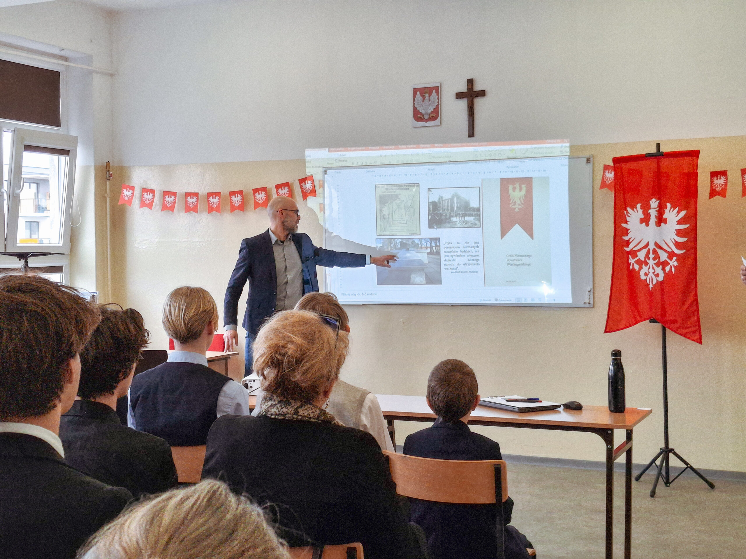 Kolejnym punktem programu był wykład pana Mirosława Sprengera, przedstawiciela IPN. Prelekcja przypomniała ogólne przyczyny wybuchu Powstania Wielkopolskiego, a następnie skupiła się na mniej znanych, ale niezwykle ciekawych aspektach północnego frontu powstania. Uczestnicy mieli okazję poznać konkretne postacie związane z regionem, zobaczyć archiwalne fotografie z okolic Pałuk i Kujaw oraz usłyszeć o faktach, które rzadko pojawiają się w podręcznikach szkolnych, a stanowią ważny element lokalnego dziedzictwa historycznego.